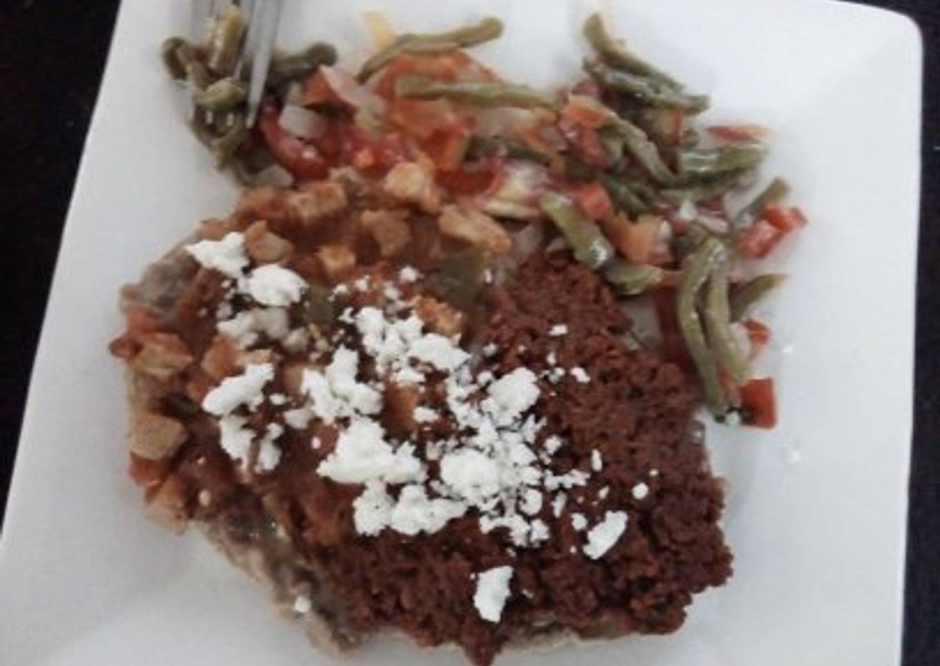 Es un desayuno completo que mi madre casi siempre servia en la festividad de día de las madres, ya que eran por la mañana, era el clásico: Carne de puerco o pierna en salsa roja quebrada, frijoles chinos refritos, nopalitos rancheros , salsa y tortillas calientes, con café con leche o jugo fresco de fruta de temporada.