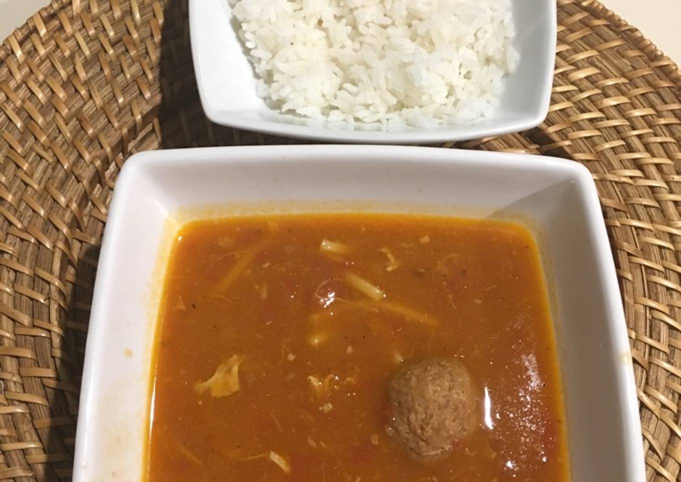 Caldo de pollo, albóndigas y banana verde