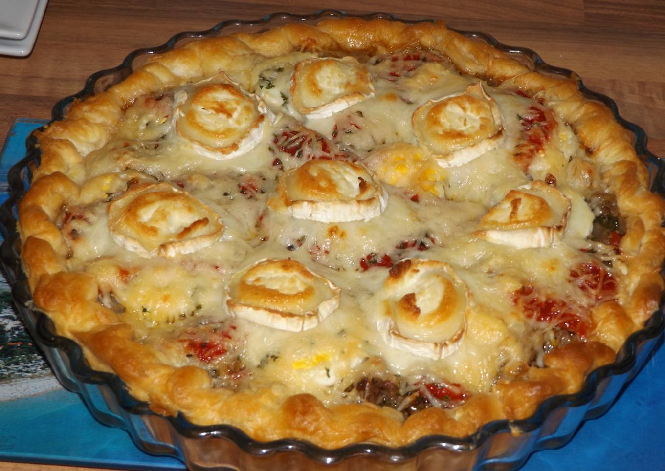 - Cubrir con perejil seco y el queso Emmental. Cortar el queso de cabra y poner en el pastel. Hacer un bordillo con la pasta. Llevar a horno precalentado a 190ºC hasta que la masa esté cocida y dorada.