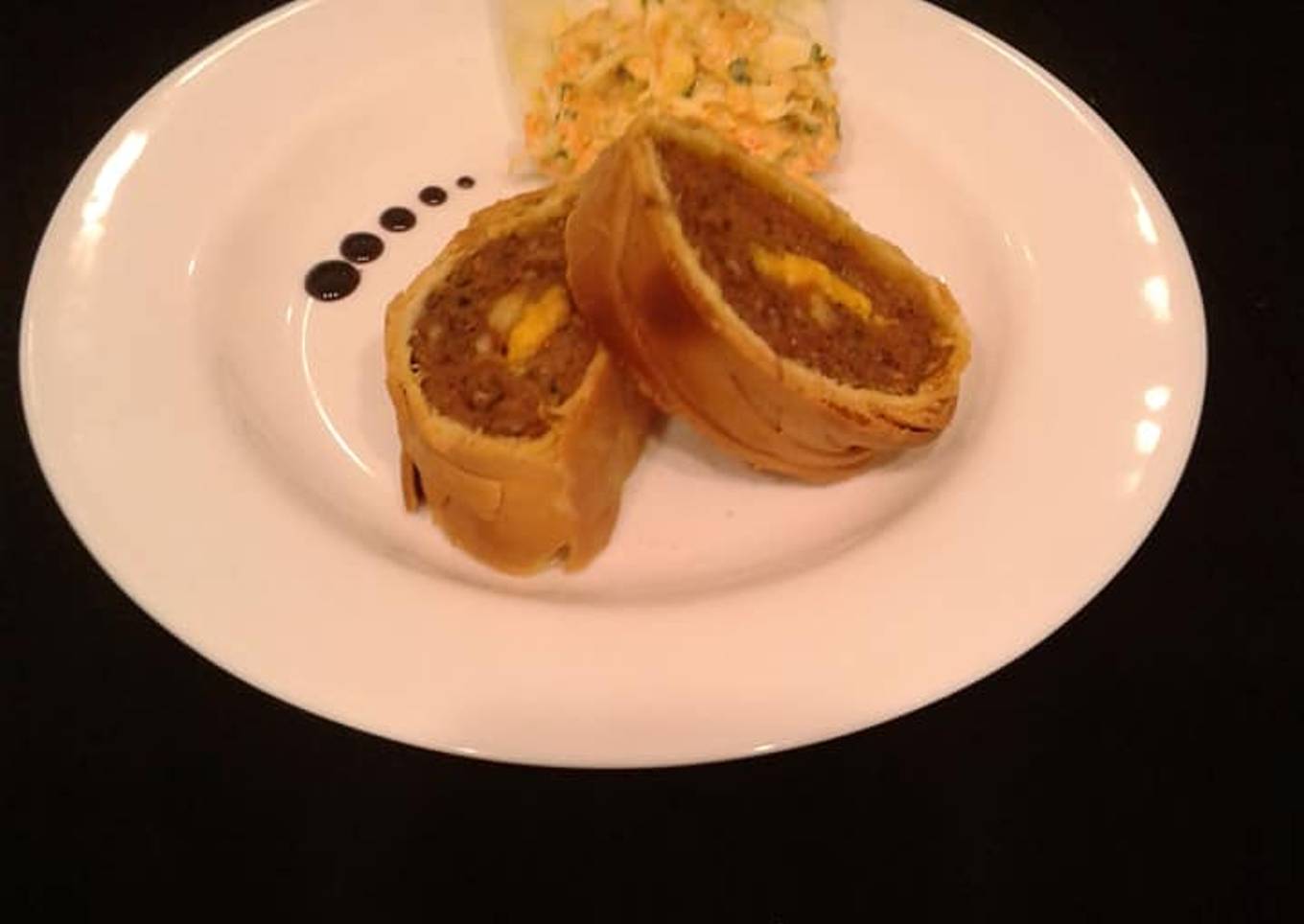 - En un bol, incorporar la carne, las especias, el pan rallado y el huevo batido. Salpimentar, mezclar muy bien. En el mesón extender la tapa de hojaldré, y colocar sobre ella las tiras de panceta, seguido de la carne. En medio de la carne introducirle trozos del queso cheddar, y darle a la carne la forma de un rollo.