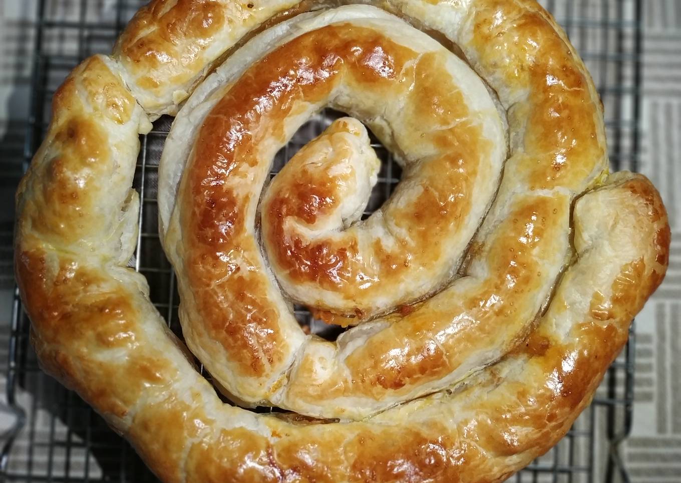 - Cortar tiras del hojaldre 3 cm de ancho poner el picadillo pegar con huevo batido pegar e ir formando el espiral forma de caracola.